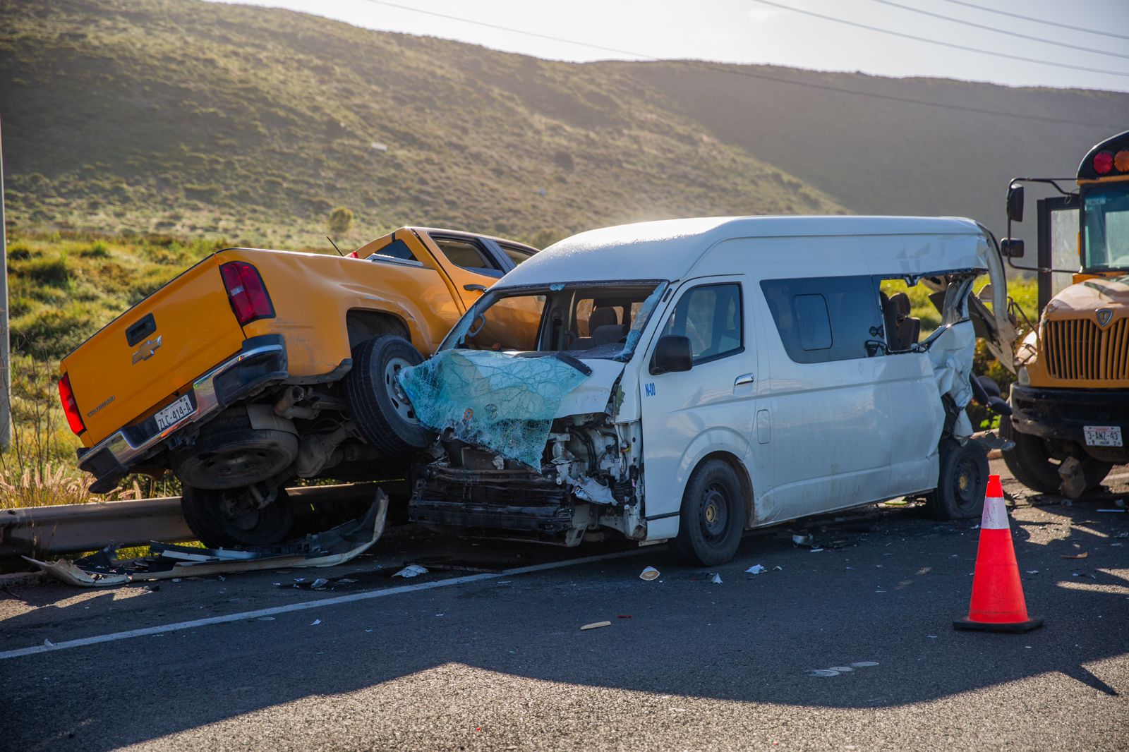 Testigos indicaron que la camioneta Pick Up se encontraba en sentido contrario en la carretera a la espera de cambiar una llanta, lo que ocasiono que la camioneta Toyota chocara con esta, y a su vez el bus de transporte.
